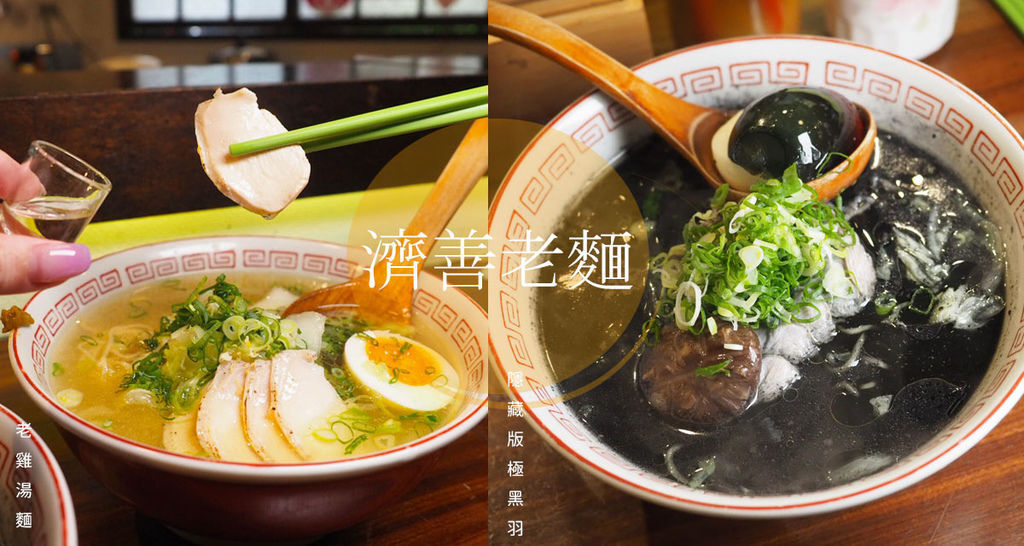 濟善老麵主打淡麗老母雞湯底拉麵,走清爽系列適合台灣人的口味,自從去年掀起一股雞湯拉麵熱潮後,我就不斷在尋找好吃的雞白湯拉麵,這次尋找到了濟善老麵,除了有受歡迎的雞白湯拉麵,還有隱藏版烏骨雞湯底的極黑羽拉麵,每日限量十碗。