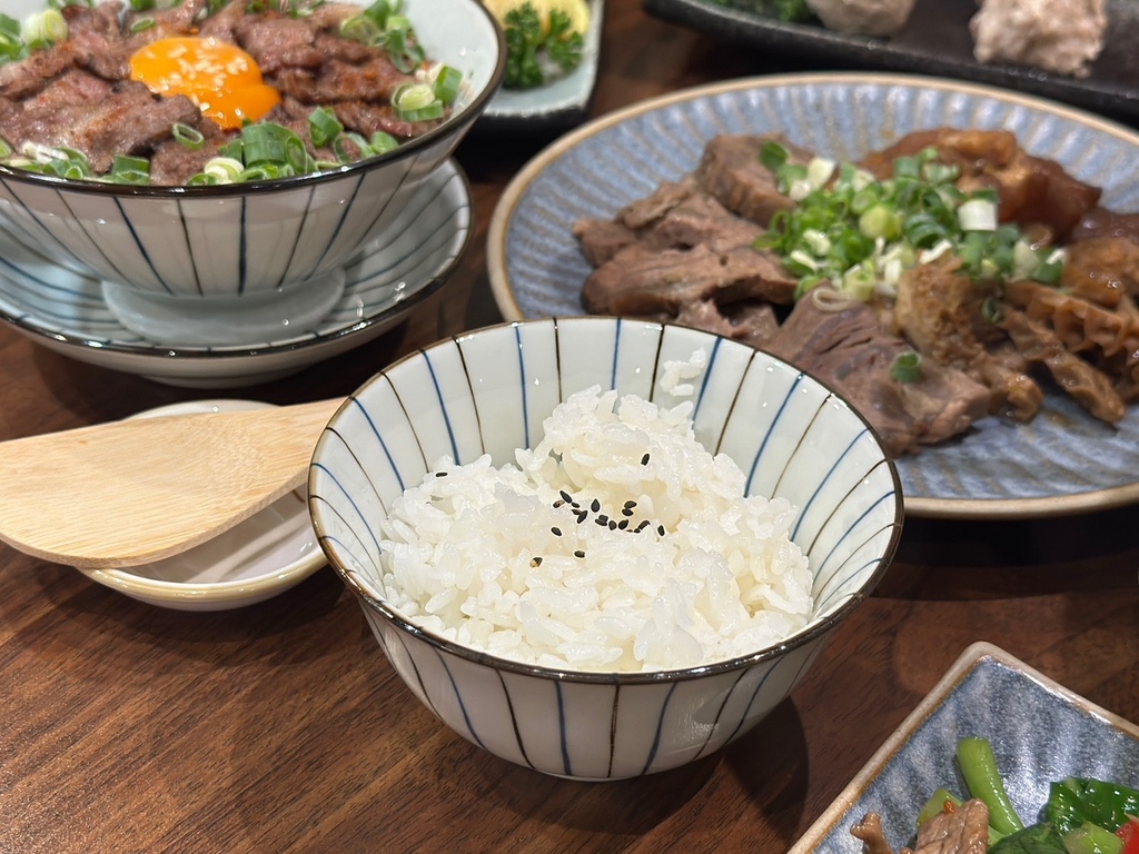 包含主菜、小菜兩樣、白飯、手沖牛肉湯,